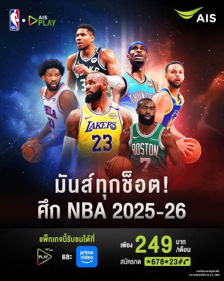 AIS PLAY จับมือกับ Prime Video ตอกย้ำการเป็นศูนย์กลางความบันเทิงและกีฬาอันดับ 1 ของประเทศไทย มอบประสบการณ์การรับชมการแข่งขันบาสเก็ตบอลที่ยิ่งใหญ่ระดับโลกแก่ลูกค้าเอไอเอส ผ่านการถ่ายทอดสดแมตช์สำคัญ ที่สามารถรับชมได้บน Prime Video เท่านั้น เติมเต็มคอนเทนต์ NBA ฤดูกาล 2025-26 แมตช์ รวมมากกว่า 290 แมตช์ ด้วยแพ็กเกจ “NBA 2025-26” ในราคาเพียง 249 บาทต่อเดือน (ไม่รวม VAT) ตอบโจทย์ไลฟ์สไตล์ของคนรักกีฬาและคอสตรีมมิง ให้สามารถรับชมศึกบาสระดับโลก พร้อมด้วยความบันเทิงระดับพรีเมียมในราคาสุดคุ้ม ด้วยการรวมสิทธิ์การถ่ายทอดสด NBA จากทั้ง AIS PLAY และ Prime Video ให้แฟนบาสเกตบอลได้สัมผัสทุกแมตช์สำคัญ พร้อมบรรยายไทยเต็มอรรถรส เสริมด้วยความบันเทิงระดับโลกจาก Prime Video Video ให้คอกีฬายุคใหม่ได้สนุก ตื่นเต้น ครอบคลุมยิ่งขึ้น และรับชมได้ทุกที่ ทุกเวลา